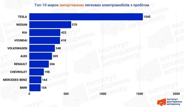 У липні лідером імпорту вживаних електромобілів в Україну традиційно залишалася Tesla - 1545 авто. Попит на моделі американського бренду не слабшає завдяки поєднанню впізнаваного іміджу, технологічності та широкої пропозиції на світових аукціонах. Друге місце зайняв Nissan (570 шт.), який стабільно постачає на наш ринок доступніші за ціною, але надійні й прості в обслуговуванні моделі, насамперед Leaf. На третьому місці - KIA (422 шт.), марка, яка поступово нарощує присутність у сегменті, пропонуючи сучасний дизайн і добрий запас ходу навіть у більш доступних варіантах. Дуже близько до KIA підійшов і Hyundai (418 шт.) - ще один південнокорейський бренд, що пропонує аналогічну за рівнем якості й оснащення техніку.