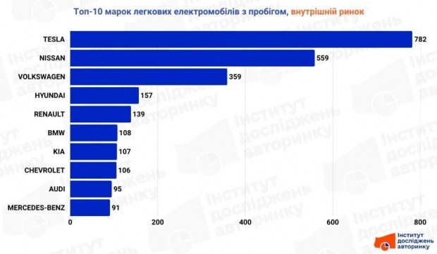 На внутрішньому ринку перепродажів вживаних електромобілів у липні лідером залишалася Tesla - 782 авто. Американський бренд утримує популярність не лише серед нових імпортерів, а й серед тих, хто вже експлуатував авто в Україні, завдяки впізнаваності, технологічності та високому попиту з боку покупців. На другому місці - Nissan (559 шт.), що традиційно приваблює тих, хто шукає доступний електромобіль для повсякденного користування. Основна маса продажів припадає на Leaf, який уже давно зарекомендував себе як «робоча конячка» у своєму сегменті. Третє місце зайняв Volkswagen (359 шт.), який поступово посилює позиції у цьому рейтингу завдяки e-Golf та сімейству ID, а ще - допомагає тут загальна прихильність українців до цієї німецької марки.