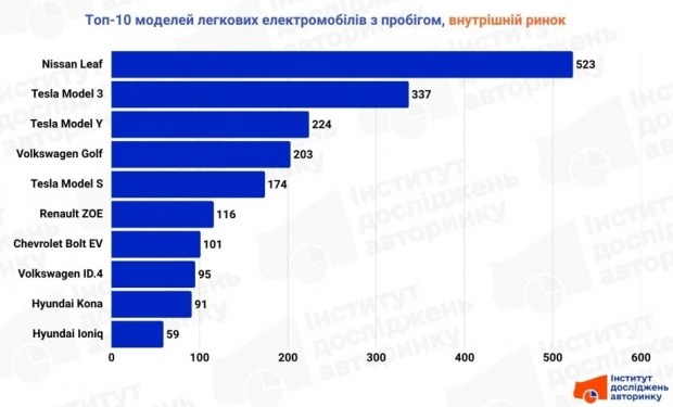 Серед конкретних моделей на внутрішньому ринку перепродажів у липні лідером залишався Nissan Leaf - 523 авто. Цей хетчбек і далі утримує статус наймасовішого електромобіля України, особливо серед тих, хто цінує простоту, дешеве обслуговування та доступні запчастини. На другому місці - Tesla Model 3 (337 шт.), яка приваблює поєднанням технологічності та більш доступної ціни порівняно з кросовером Model Y, що опинився на третьому місці (224 шт.).