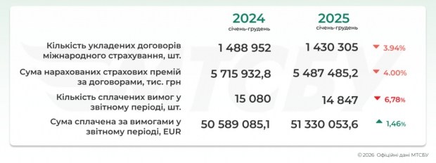 Зменшення обсягу премій зумовлене пропорційним скороченням кількості укладених договорів. Упродовж 2025 року українські водії уклали понад 1,4 млн страхових сертифікатів «Зелена картка», що також на 4% менше, ніж торік.