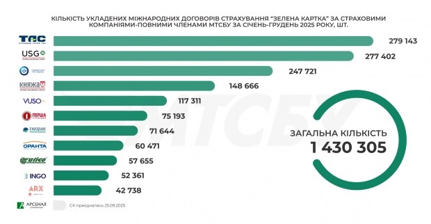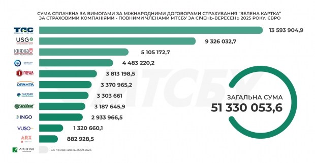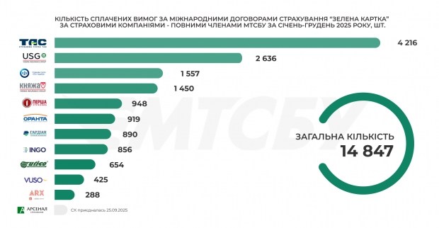 Загалом протягом 2025 року страховиками було врегульовано 14 847 страхових випадків за сертифікатами «Зелена картка», що на 6,78% менше, ніж у 2024 році (15 080 випадки). Найбільша кількість урегульованих вимог від іноземних врегулювальників стосувалася договорів «Зелена картка», укладених зі страховою компанією «ТАС» - 4 216 штук, а загальна сума відшкодування за ними становить 13,6 млн євро.