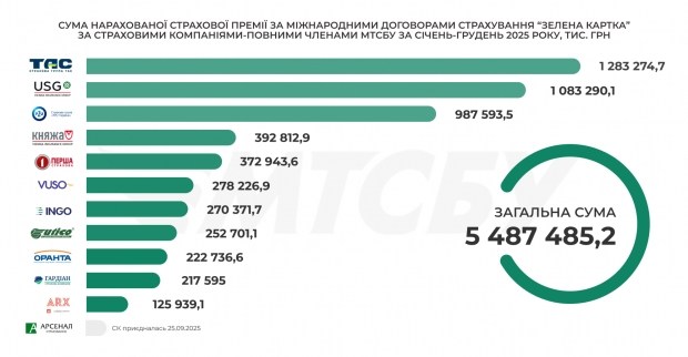 Лідерами за сумою нарахованих страхових премій у 2025 році стали страхові компанії «ТАС», «Українська страхова група» та «ПЗУ Україна».