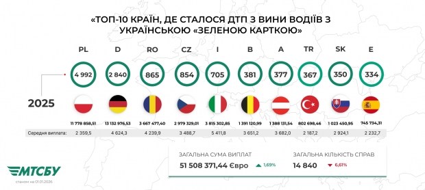 Водночас в минулому році українські страхові компанії виплатили понад 51,3 млн євро страхових відшкодувань потерпілим у ДТП за кордоном з вини українських водіїв, які мали чинний сертифікат «Зелена картка», що на 1,46% більше, ніж за аналогічний період 2024 року. Зазначений обсяг виплат також включає врегулювання справ, відкритих у попередні роки.