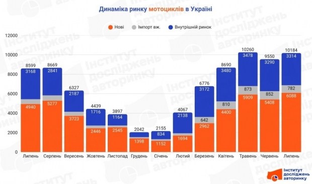 Загальний обсяг офіційно оформлених покупок мотоциклів усіх типів у липні склав 10,2 тис., і це найбільше значення, яке зафіксовано на діаграмі, котра нижче. Ці обсяги більші, ніж були у попередньому місяці (червні) на 6,6%, та більші, ніж було торік у липні-2024, на помітні 18,4%.