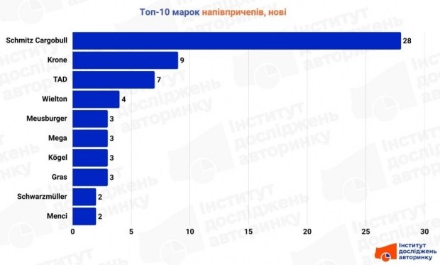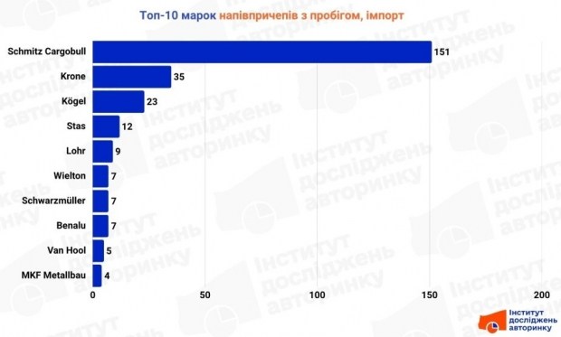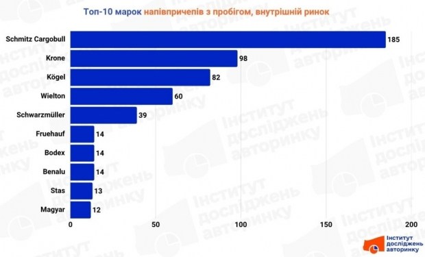 Найбільшу частку склали внутрішні перепродажі - 65,6% (803 шт.), далі - імпорт вживаних, 28,3% (346 шт.). Нові імпортовані напівпричепи охопили 5,1% (62 шт.), ще 1,1% (13 шт.) - техніка, виготовлена в Україні.