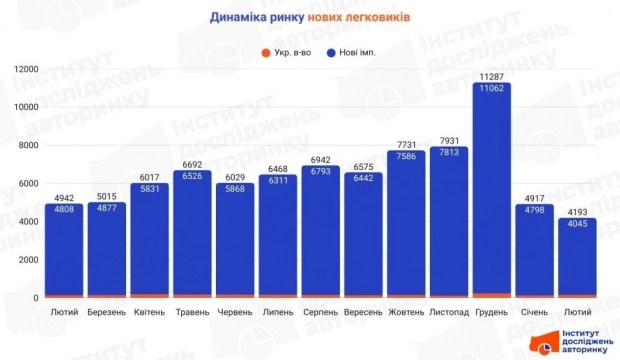 Загальна кількість перших реєстрацій нових легковиків у лютому склала 4193 авто. Це не той результат, який змусить шампанське відкриватися в автосалонах.