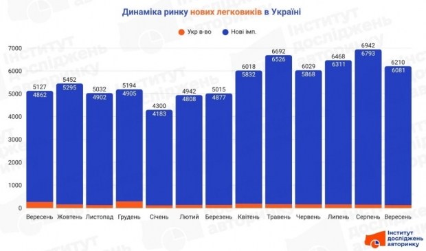 Впродовж вересня 2025 року українці та місцеві підприємства придбали 6,2 тисячі нових легковиків. У річному порівнянні з вереснем 2024 року маємо збільшення обсягів на 21,1%, але коли рівняти цьогорічний вересень до серпня - отримуємо мінус 10,5%.