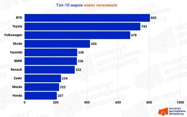 Серед марок найбільше на першу реєстрацію було подано легкових автомобілів з емблемами BYD, Toyota та Volkswagen. Ось ТОП-10 виробників за підсумками вересня поточного року: