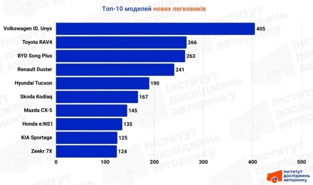 Першість серед окремих марок цього разу у кросовера з німецьким лого, проте китайським корінням - Volkswagen ID.Unyx (переважно реєстрували оновлену версію з індексом 06). Друга позиція в «старожила ринку» - Toyota RAV4, на третій позиції знову китайський продукт, уже не зі спільного підприємства, а самостійний - BYD Song Plus.