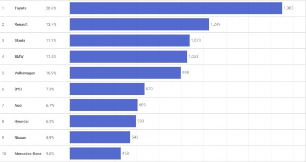 Серед марок найбільше на першу реєстрацію було подано легковиків з емблемами Toyota, Renault та Skoda. Ось ТОП-10 виробників за підсумками першої чверті року: