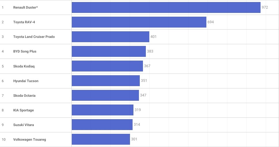 З-поміж окремих моделей, подібно як і торік, найчастіше автосалони покидали Renault Duster та Toyota RAV4. Різниця у кількості між наступними учасниками значно більша відносно лідерів цього ТОП-10, але значно менша між ними. За такого порівняно невеликого контрасту всього кілька автомобілів мають вплив на фінальну квартальну позицію моделі у списку. Що зрештою можна пояснити ще чималою конкуренцією між низкою кросоверів одного габаритного (подекуди й цінового) класу. Цікаво, що у десятці найпопулярніших легковиків залишився всього один ліфтбек - Skoda Octavia, решта - кросовери.