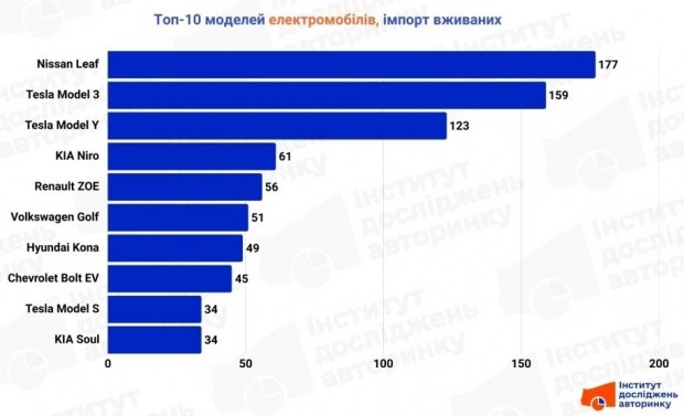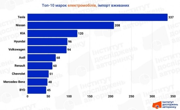 - Tesla (337 шт.) - залишається лідером, але це швидше інерція та доїзд тих машин, що застрягли в портах, логістичних терміналах, чи на автосервісах (якщо авто аукціонні).