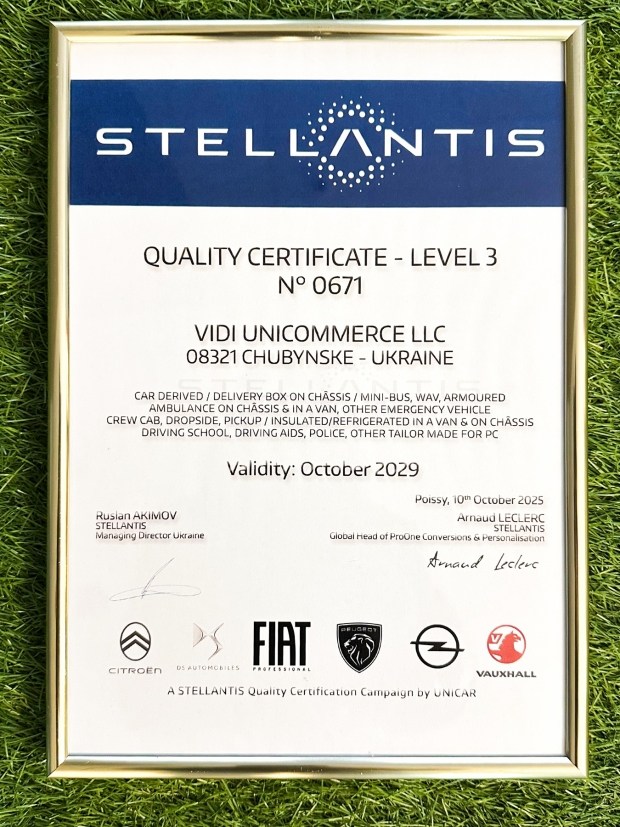 Крім того, Концерн Stellantis прагне забезпечити клієнтам максимально якісну продукцію, на яку можна покластись в роботі. Саме для цього була запроваджена процедура сертифікації Stellantis для компаній-партнерів з переобладнання, що працюють з автомобілями Концерну. І нещодавно кількість таких компаній-партнерів в Україні знову зросла - адже міжнародний сертифікат якості від Stellantis отримала компанія «ВІДІ Юнікомерс»!