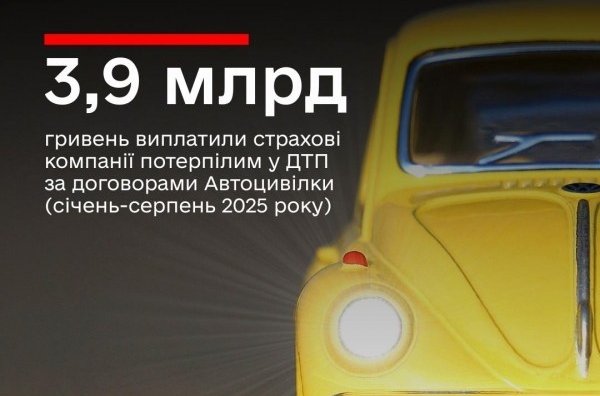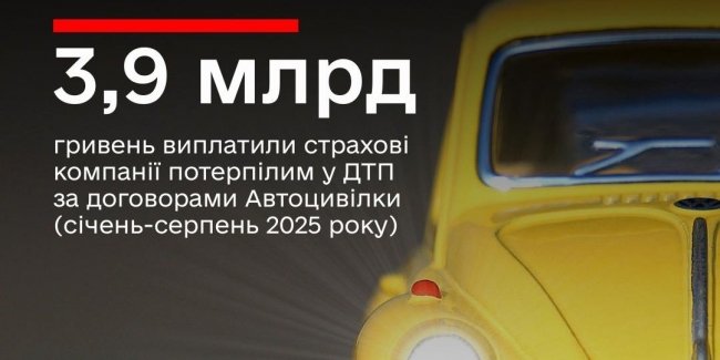 За січень-серпень страхові компанії виплатили потерпілим у ДТП понад 3,9 млрд грн та врегулювали 95 828 випадків. У порівнянні з 2024 роком: кількість випадків зросла на 1,83%, а розмір виплат - на 27,13%.
