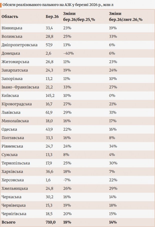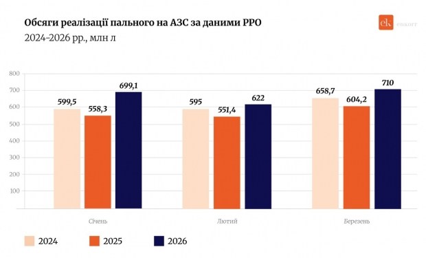 Незважаючи на високі ціни, реалізація всіх видів пального (бензин, дизель, газ) не тільки не знизилася, а й зросла до найбільшого березневого значення як мінімум з 2024 року. Згідно з даними Державної податкової служби України, проливи пального становили 710 млн л, що на 14% більше за показники лютого і майже на 18% - за аналогічний період минулого року.