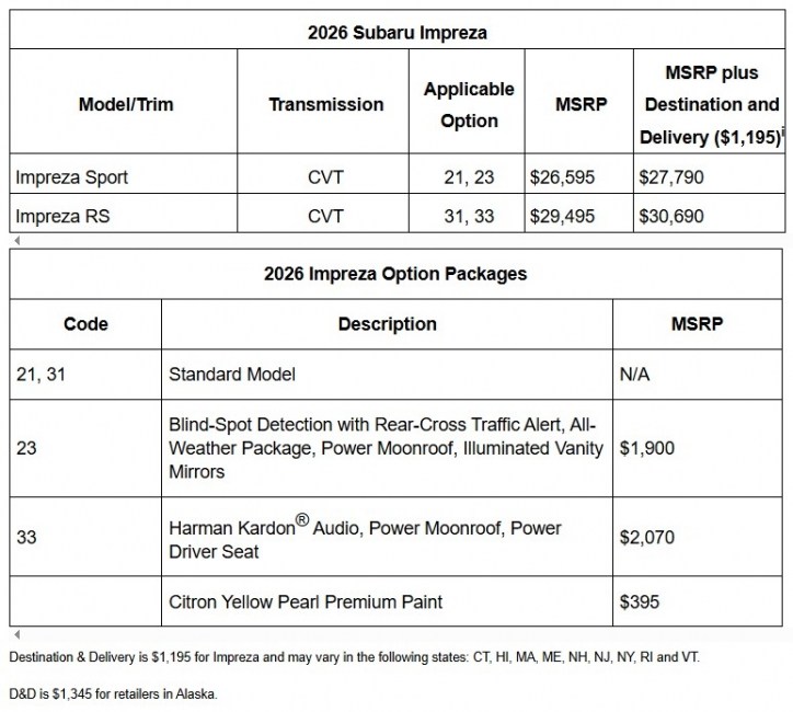 Як зазначає Carscoops, ціна Impreza 2026 року зросла в ціні з 24 360 до 26 595 доларів, але це зростання зумовлене тим, що тепер модель доступна лише у двох комплектаціях: Sport та RS.