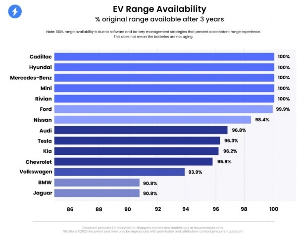 У середньому, Tesla утримує понад 96% первісного запасу ходу - тобто втрати мінімальні. Cadillac, Hyundai і Mercedes-Benz - серед лідерів за стабільністю, а Volkswagen, BMW та Jaguar втратили до 10%.