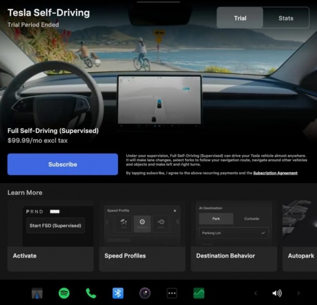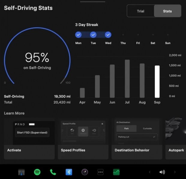 Найпомітнішою функціональною новацією став оновлений інтерфейс підписки на систему повністю автономного керування, яка в інтерфейсі тепер позначається як Self-Driving (Supervised). Для автомобілів із апаратною платформою AI4 (HW4) Tesla запропонувала новий додаток, що дозволяє оформити підписку буквально одним дотиком - за 99,99 долара на місяць. Окрім цього, з'явилася окрема панель статистики, яка відстежує використання функції: система показує щоденну серію поїздок із активованим автопілотом і порівнює пробіг із увімкненим та вимкненим режимом. Такий підхід фактично перетворює використання функції на своєрідну «гру», стимулюючи водіїв не лише підписуватися, а й регулярно користуватися сервісом. Водночас у цьому розділі відсутня інформація про втручання водія або відключення системи, що залишається дискусійним моментом.
