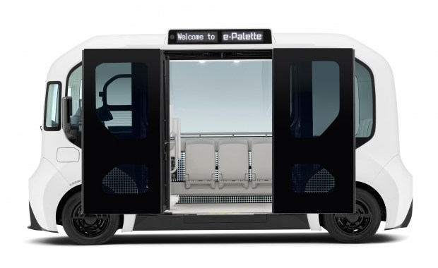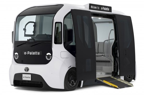 Електробус Toyota e-Palette невелика модель, яка може використовуватися в якості маршрутного таксі. Він вирізняється футуристичним дизайном із великою площею скління. Для зручності посадки і висадки встановлені розсувні двері та розкладний пандус.