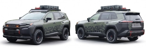 Першим із трьох шоу-карів стане Toyota RAV4 Outdoor Style Concept. Цей проєкт орієнтований на активний спосіб життя, подорожі та бездоріжжя і показує, як нове покоління RAV4 може виглядати в максимально «позашляховому» виконанні. Концепт отримав темно-зелений колір кузова з чорними акцентами, збільшений дорожній просвіт і масивні елементи захисного обвісу. Передній бампер виконано з матового чорного пластику, у ньому з'явилися яскраво-червоні буксирувальні гаки, що підкреслюють утилітарний характер автомобіля.