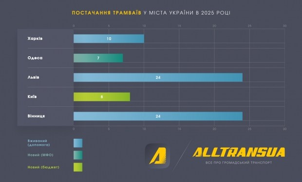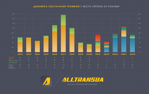 Трамвайний ринок в 2025 році дещо просів, порівняно з 2023 та 2024 роками, однак усе так само тримався на отриманні вживаних вагонів. З 73 трамвайних вагонів (тут і надалі не враховано вагони Schindler Be 4/6, які отримав Львів з кантону Базельланд як донори запчастин для вагонів Schindler Be 4/8), отриманих протягом року, 58 - це вживані вагони, а 15 - нові, придбані за бюджетний кошт та в рамках співпраці з Міжнародними фінансовими організаціями (МФО).