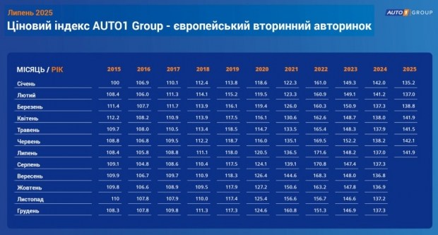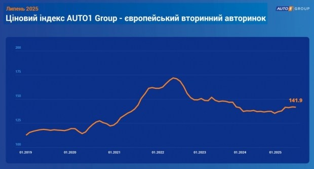 Наприкінці липня 2025 року індекс цін, котрий регулярно визначають аналітики AUTO1 Group, зупинився на позначці 141,9. Це дещо менше, ніж було у червні цього ж року (142,1). Проте у відсотковому вираженні ця зміна складає лише -0,1% - що дає підстави говорити, що ціни минулого місяця залишалися стабільними.