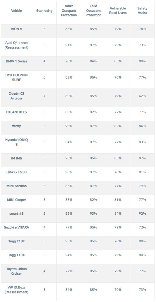 З усіх цих автомобілів чотири зірки отримали лише BMW 1 серії, Citro?n C5 Aircross, Suzuki eVitara та його близнюк Toyota Urban Cruiser. Інші моделі показали відмінний рівень захисту. Проте, експерти зазначили, що Lynk & Co 08 та Volkswagen ID.Buzz ледь не втратили п'яту зірку через поганий захист тазу пішоходів під час зіткнення. Попри це, сукупність результатів після усіх краш-тестів дозволила їм отримати найвищий бал.