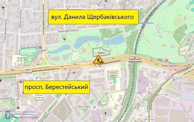Крім того, 18 серпня з 8:00 до 16:00 буде частково обмежено рух проспектом Берестейським у напрямку виїзду з міста, в районі зупинки громадського транспорту «Парк Нивки». Тут дорожники КП ШЕУ Шевченківського району ремонтуватимуть асфальтобетонне покриття.