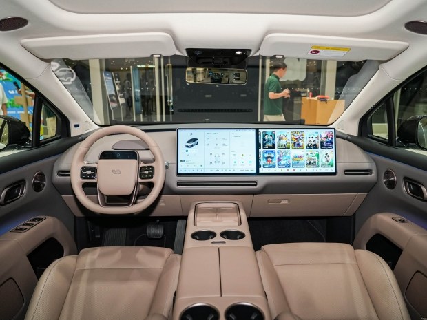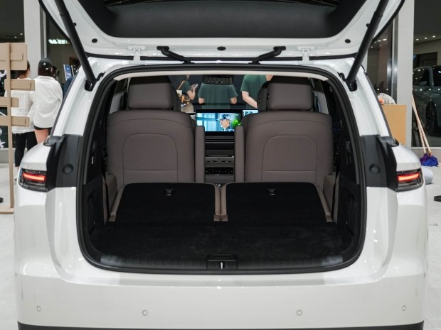 У салоні Li Auto i8 немає традиційного щитка приладів, зате на передній панелі встановили два величезних 15,7-дюймових тачскріни. Ще один монітор опускається з даху для задніх пасажирів.