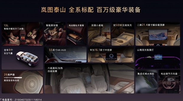 Voyah Taishan також може похвалитися розкішними деталями в інтер'єрі: за інформацією IT Home, салон натхнений традиційною китайською архітектурою та пейзажами гір і води, що підкреслює естетичний підхід бренду до дизайну. Колірна гамма внутрішнього оздоблення включає відтінки «темна вишня», «м'ятний» і «теплий коричневий», а зовнішні варіанти - це, зокрема, пастельні та насичені тони, які створюють враження витонченості й преміальності.
