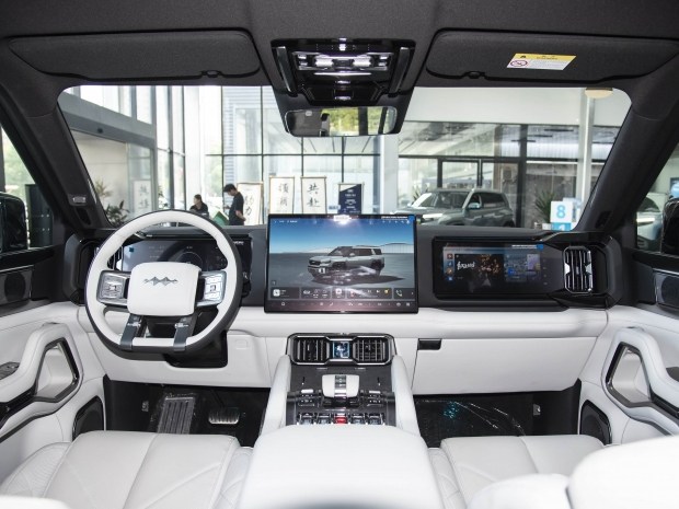 Інтер'єр Leopard 8 виконано у фірмовому стилі бренду Fangchengbao, який BYD позиціонує як преміальну підмарку для позашляховиків. Панель приладів поєднує одразу кілька дисплеїв: 12,3-дюймовий цифровий щиток, 17,3-дюймовий центральний екран мультимедійної системи, 12,3-дюймовий дисплей для переднього пасажира та 50-дюймовий проекційний AR-HUD. Всі екрани взаємопов'язані й підтримують синхронну роботу. Автомобіль оснащений оновленою системою DiLink 150, яка працює на базі потужного чипа BYD 9000 та використовує AI-модель для поліпшення користувацького досвіду. Крім того, система підтримує інтеграцію з Huawei - додатки зі смартфона можна безпосередньо передавати на екран автомобіля через функцію «Fanghua».