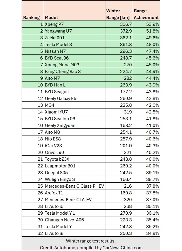 Окремий акцент було зроблено саме на зимовому запасі ходу, оскільки це одна з головних претензій до електромобілів у країнах із холодним кліматом. Результати підтвердили відомі з теорії, але часто недооцінені на практиці фізичні обмеження. Літій-іонні батареї втрачають ефективність на морозі через зростання внутрішнього опору, додаткові витрати енергії на підігрів самої батареї та значне навантаження від системи опалення салону. У підсумку більшість автомобілів у тесті втратили понад половину заявленого запасу ходу. При цьому варто враховувати, що порівняння велося з китайським циклом CLTC, який сам по собі вважається досить оптимістичним, тому падіння реальних показників виглядало ще більш показовим.