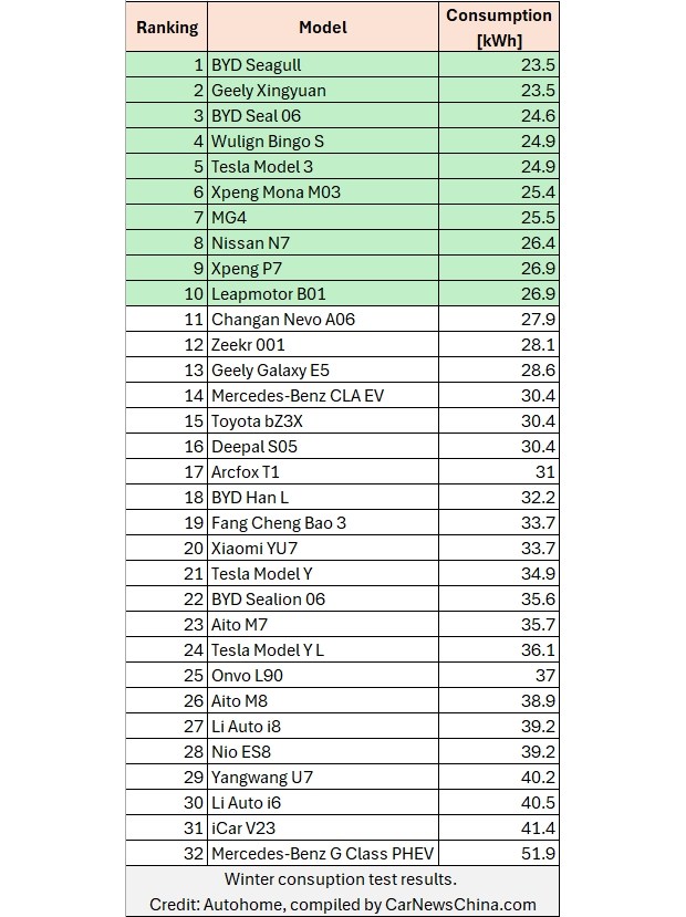 Не менш показовими виявилися результати тестів енергоефективності, де вимірювалося реальне споживання електроенергії на 100 км у мороз. Тут перевага була на боці компактних і легких автомобілів. Найекономічнішими виявилися BYD Seagull і Geely Xingyuan з показниками близько 23,5 кВт-год на 100 км, за ними - BYD Seal 06. Tesla Model 3 у цьому сценарії знову підтвердила високий рівень оптимізації, показавши споживання на рівні 24,9 кВт-год, що є дуже сильним результатом для умов із постійно увімкненим опаленням та низькими температурами.
