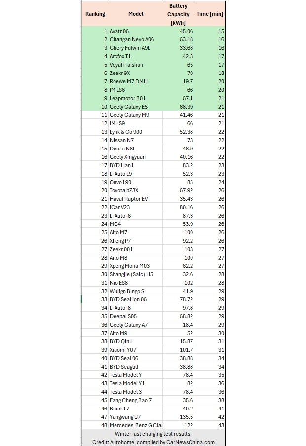 Окремо перевіряли і швидкість швидкого заряджання в екстремальному холоді, з інтервалом від 30% до 80%. Тут несподіваним лідером став Avatr 06, якому знадобилося лише 15 хвилин, тоді як багато популярних моделей витрачали вдвічі більше часу. Для порівняння, Tesla Model Y у цьому сценарії показала значно скромніший результат, що ще раз підкреслює, наскільки складно забезпечити стабільну зарядну потужність у мороз навіть для технічно зрілих платформ.