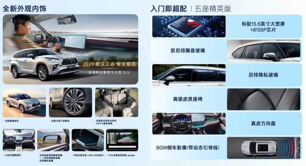 Оновлений Toyota Highlander 2026 модельного року офіційно представлено на китайському ринку спільним підприємством GAC Toyota. Як і очікувалося, зовнішність кросовера залишилася практично без змін, адже модель зберегла впізнаваний дизайн і габарити попередника: довжина 4965 мм, ширина 1930 мм, висота 1750 мм, колісна база 2850 мм. Наразі у продажу доступна лише п'ятимісна версія. Вартість новинки стартує з 219 800 юанів, що приблизно відповідає 30 тисячам доларів США.