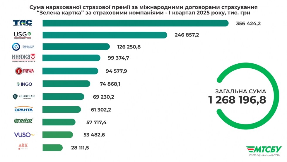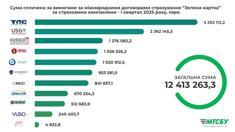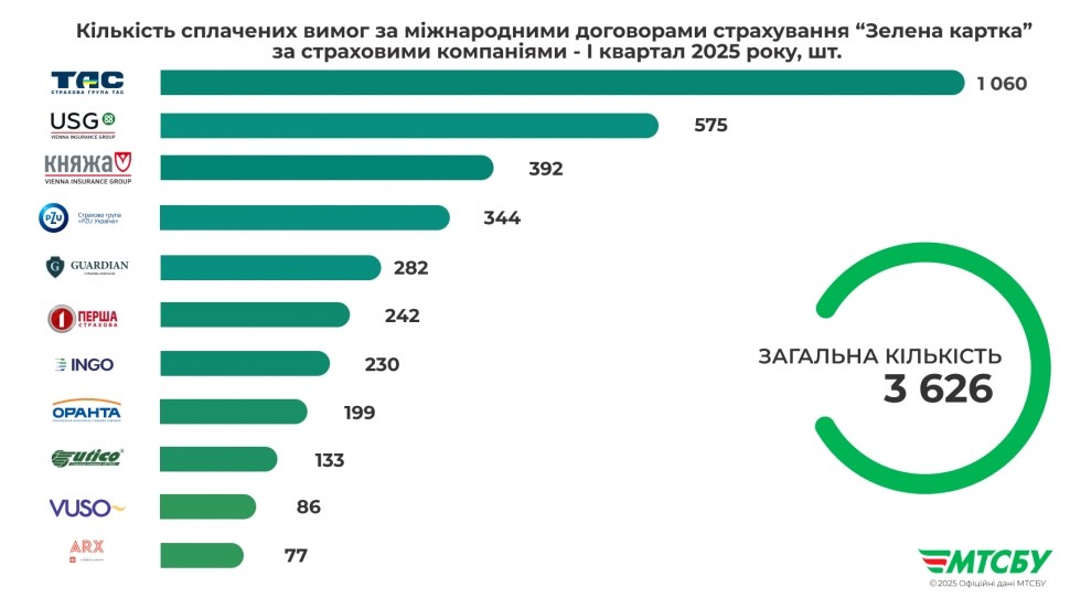 За І квартал 2025 року найбільша кількість урегульованих вимог від іноземних врегулювальників стосувалася договорів «Зелена картка», укладених з СК «ТАС» - 1 060 штук, а загальна сума відшкодування за ними становить 3,3 млн євро.