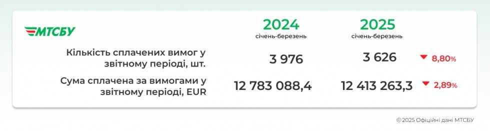 У січні-березні 2025 року іноземні врегулювальники подали 3 626 вимог щодо ДТП, скоєних українськими водіями за кордоном - це на 8,8% менше, ніж за аналогічний період 2024 року. Сума сплаченого відшкодування становила 12,4 млн євро, що на 2,89% менше, ніж торік.