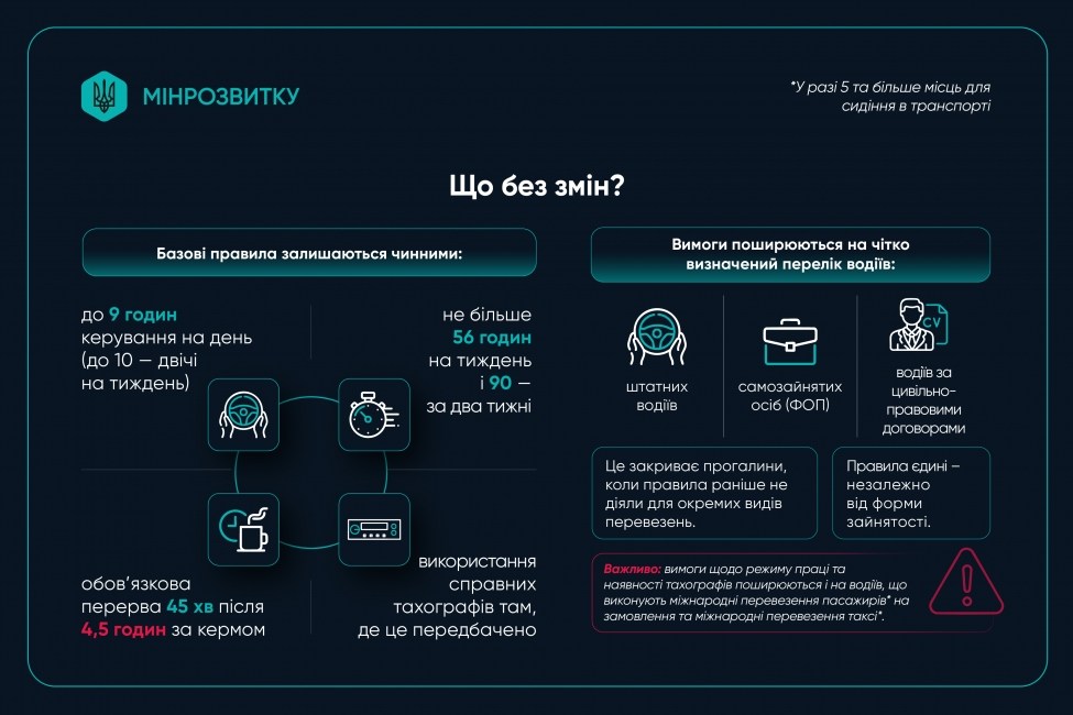1. Розширення вимог щодо тахографів та режиму праці для водіїв. Вимоги щодо тахографів та режиму праці поширюються на водіїв (включаючи ФОП), що виконують міжнародні перевезення пасажирів на замовлення та міжнародні перевезення таксі. Раніше це питання не було врегульоване, що створювало ризики для безпеки перевезень.