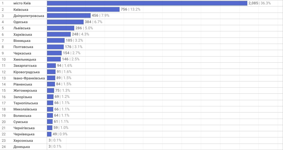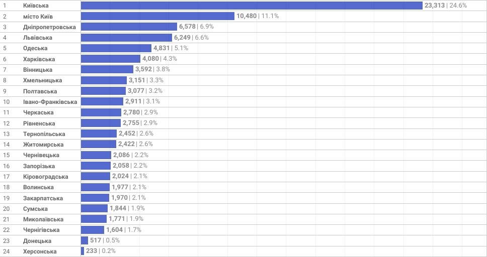 Найвища активність у цьому сегменті традиційно спостерігалася у Київській області та у місті Києві. Також до трійки лідерів увійшла цього разу Дніпропетровська область, з порівняно незначним відривом від Львівської.