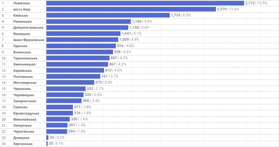 Найменші показники за цей період, як і в попередньому розділі, у Донецькій та Херсонській областях.
