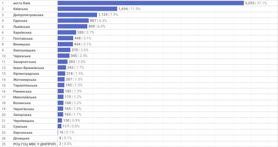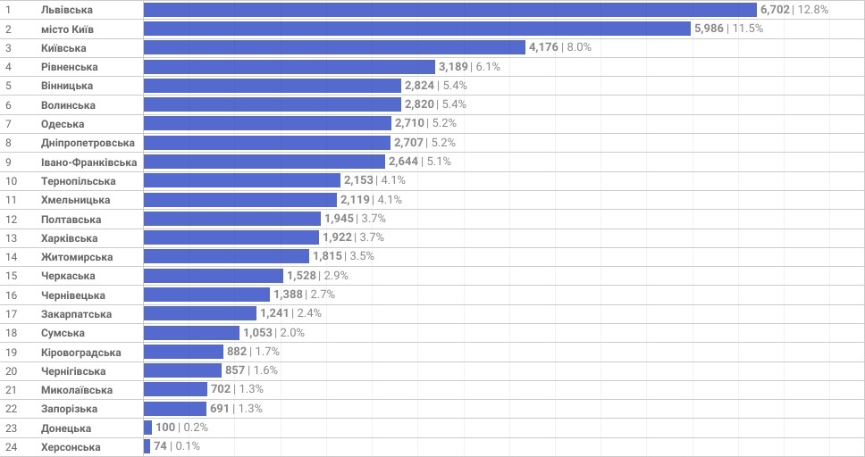 Статистичними аутсайдерами з яскраво вираженим результатом виявилися дві області: Донецька та Херсонська, через часткову окупацію та близькість лінії фронту. Тут і далі відсутні дані з АР Крим та Луганської області.