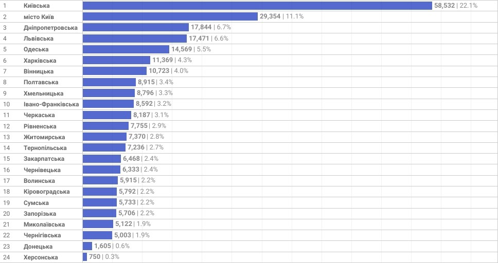 Найвища активність у цьому сегменті традиційно спостерігалася у Київській області та у місті Київ. Також до трійки лідерів увійшла цього разу Дніпропетровська область, з незначним відривом від Львівської.