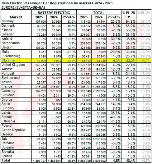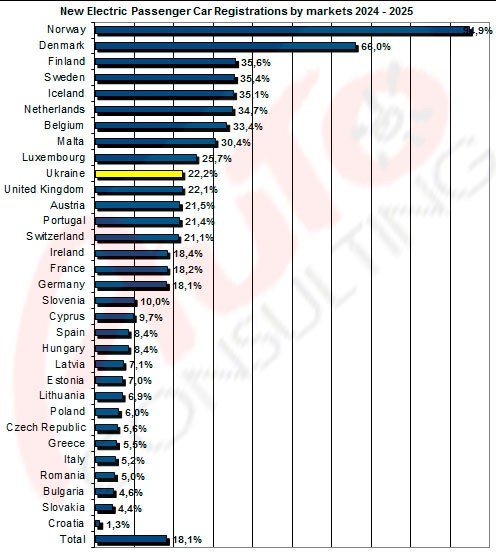 За підсумками продажів нових електромобілів за 9 місяців 2025 року Україна піднялась в рейтингу серед країн Європи. В цьому році електрокари в Україні вже займають 22,2% на новому авторинку та 10 місце серед європейських країн.