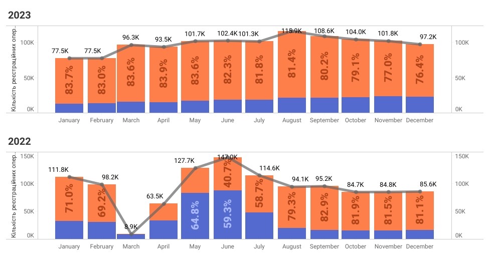Перших реєстрацій легковиків з пробігом минулого року зафіксовано 220,9 тис., майже удвічі менше (на 45,3%) ніж у 2022 році, коли було імпортовано 403,9 тис. автомобілів. Так тому, що у травні-липні 2022 українська влада запровадила пільги на ввезення автотранспорту, так зване «нульове розмитнення», яке й дало цей помітний поштовх сегменту імпорту.