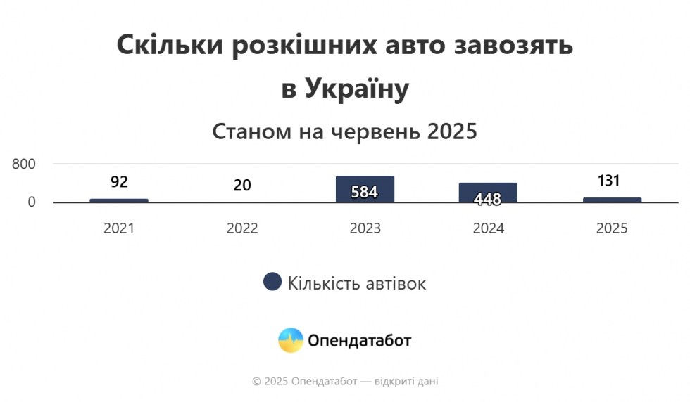 Для порівняння: за аналогічний період 2024 року завезли 448 дорогих авто (в 3,4 рази більше), а в 2023 - 584. А от порівняно із 2021 роком відзначається зростання на 42%.