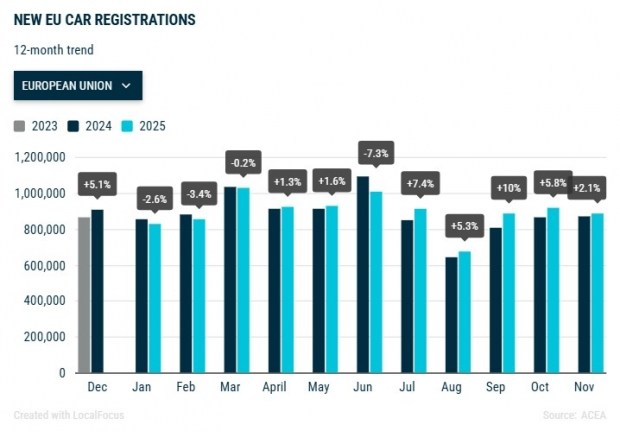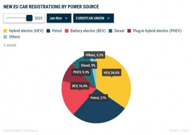 Сукупно з січня по листопад 2025 року повністю електричні легкові автомобілі зайняли 16,9% ринку ЄС, що є відчутним зростанням порівняно з 13,4% за аналогічний період 2024 року. Гібридні автомобілі забезпечили 34,6% усіх реєстрацій і зберегли статус наймасовішого сегмента. Натомість сумарна частка машин з бензиновими та дизельними двигунами скоротилася до 36,1%, тоді як роком раніше вона становила 45,8%, що підкреслює прискорений відхід європейського ринку від традиційних видів пального.