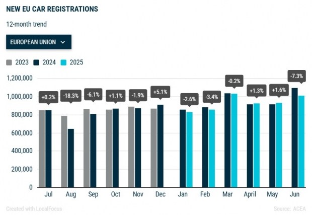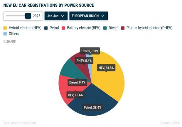 До червня 2025 року електромобілі становили 15,6% ринку ЄС, що є збільшенням порівняно з низьким базовим рівнем у 12,5% у першій половині 2024 року. Реєстрація гібридних електромобілів продовжує зростати, захоплюючи 34,8% ринку, залишаючись кращим вибором серед споживачів ЄС. Тим часом сукупна частка ринку бензинових та дизельних автомобілів впала до 37,8% порівняно з 48,2% за аналогічний період 2024 року.