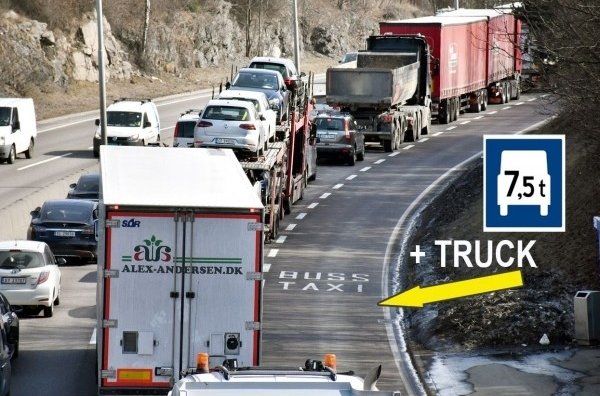 Інтенсивний рух вантажівок у смузі руху автобусів також ввів нову норму: відтепер на tungtrafikkfelt в'їзд легковим електромобілям заборонено - їдуть у загальному потоці, а не в «автобусному», як це було раніше.