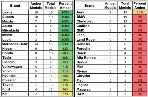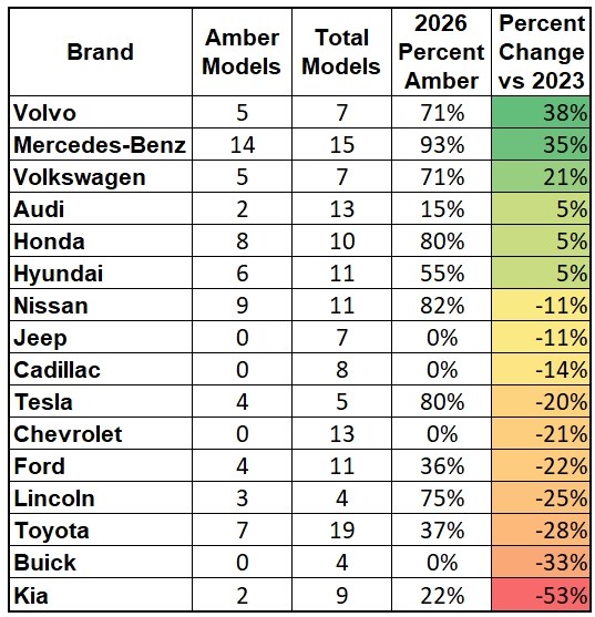 Найбільше «внесли» у падіння частки помаранчевих сигналів такі гіганти, як Toyota, Ford, General Motors та Kia. Навіть активні зусилля Mercedes не змогли врівноважити цей тренд.