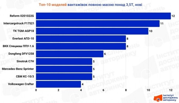 Ці авто можуть виглядати як інкасаторські, паливозаправники, машини для ЖКГ чи автогідропідіймачі, але в статистиці вони йдуть під окремими локальними іменами. Втім, на другому плані ще видніються звичні Sprinter, Crafter, Sinotruk та Dongfeng, які також формують пул нового українського автопарку.